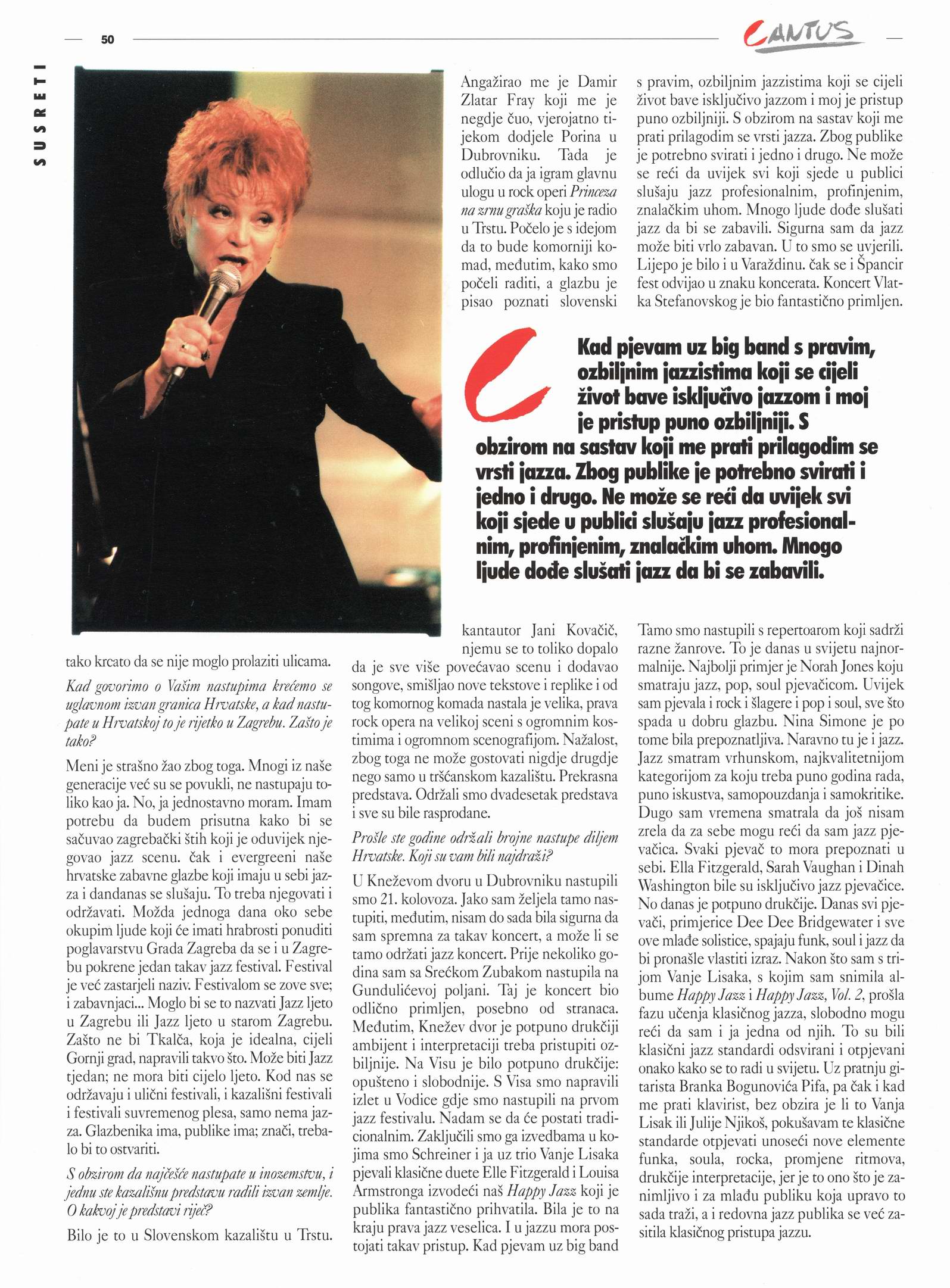 ZDENKA KOVAČIČEK OSTAJE PRVA DAMA NAŠEG JAZZ VOKALA ZAHVALJUJUĆI TO PONAJPRIJE SVOM SMISLU ZA INTERPRETACIJE TOG ŽANRA, SMISLU ZA IMPROVIZACIJU KAO I ZA JAZZ PRIMJERENU GLASU.